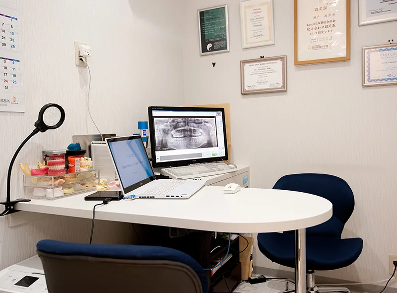 スタッフと1対1でゆっくり話せるカウンセリングルームを設けています。プライバシーに配慮した個室で、他の患者様に聞かれたくないことも安心してお話しいただけます。写真や模型、動画など必要に応じて活用しながら、わかりやすく治療計画をご説明いたします。