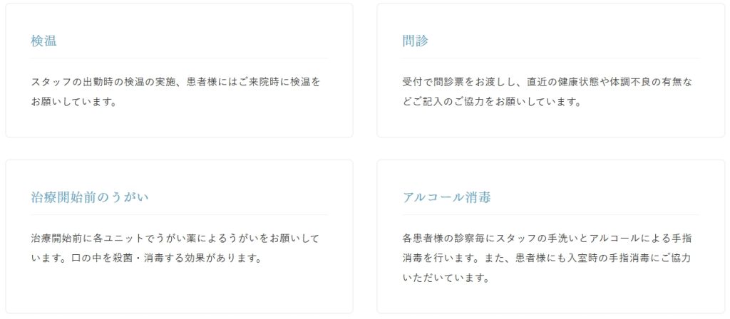 当クリニックでは感染症対策に力を入れています。治療に使用する器具は滅菌されていますので、安心して治療をお受けください。 また、グローブ(ゴム手袋)、紙コップ、エプロンは当然、患者様毎に必ず使い捨てをしております。